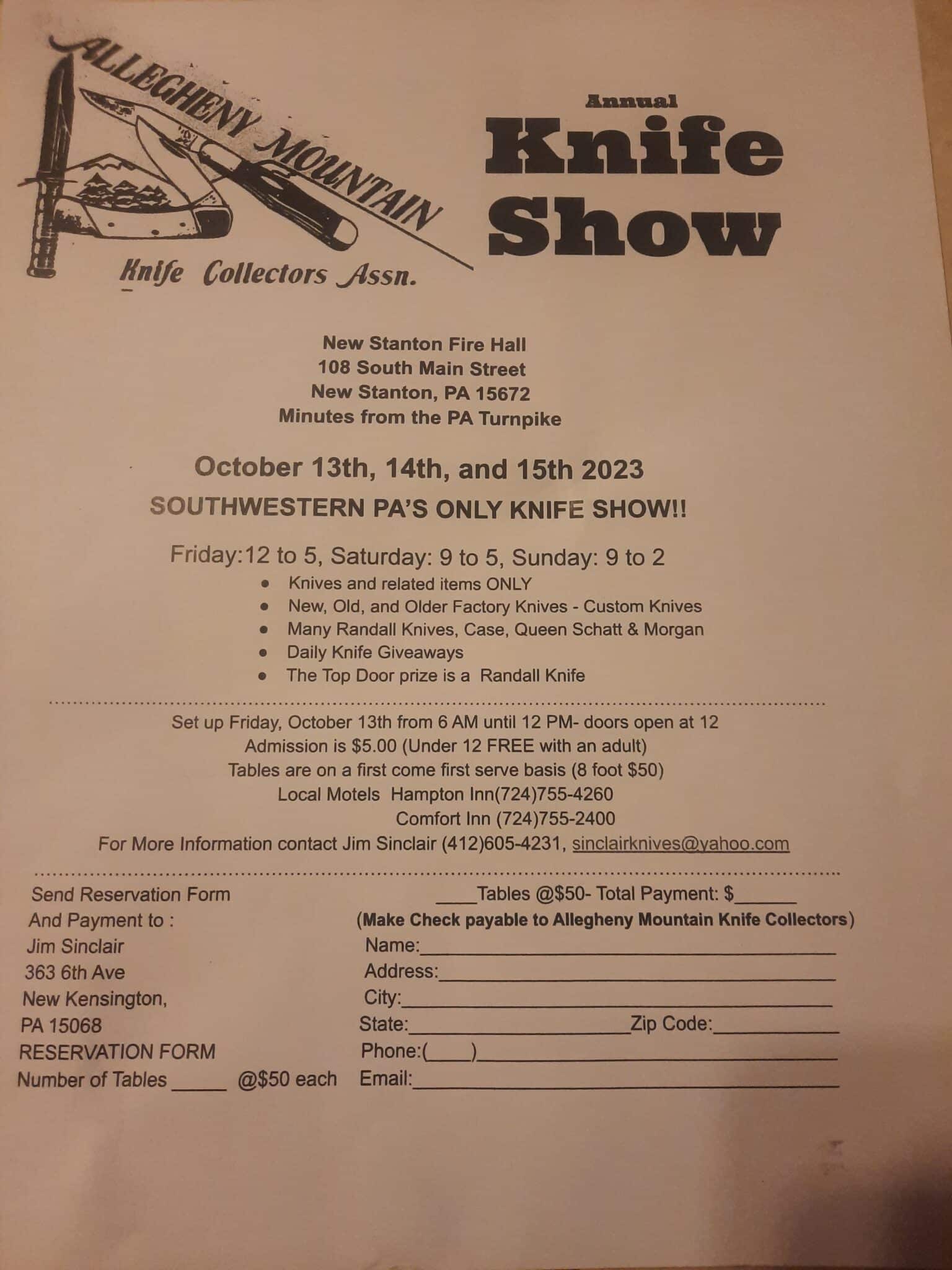 The Allegheny Mountain Knife Show currently has no upcoming dates scheduled in New Stanton, PA. This New Stanton knife show is held at New Stanton Fire Hall and hosted by Allegheny Mountain Knife Collectors Association. All federal and local firearm laws and ordinances must be obeyed.