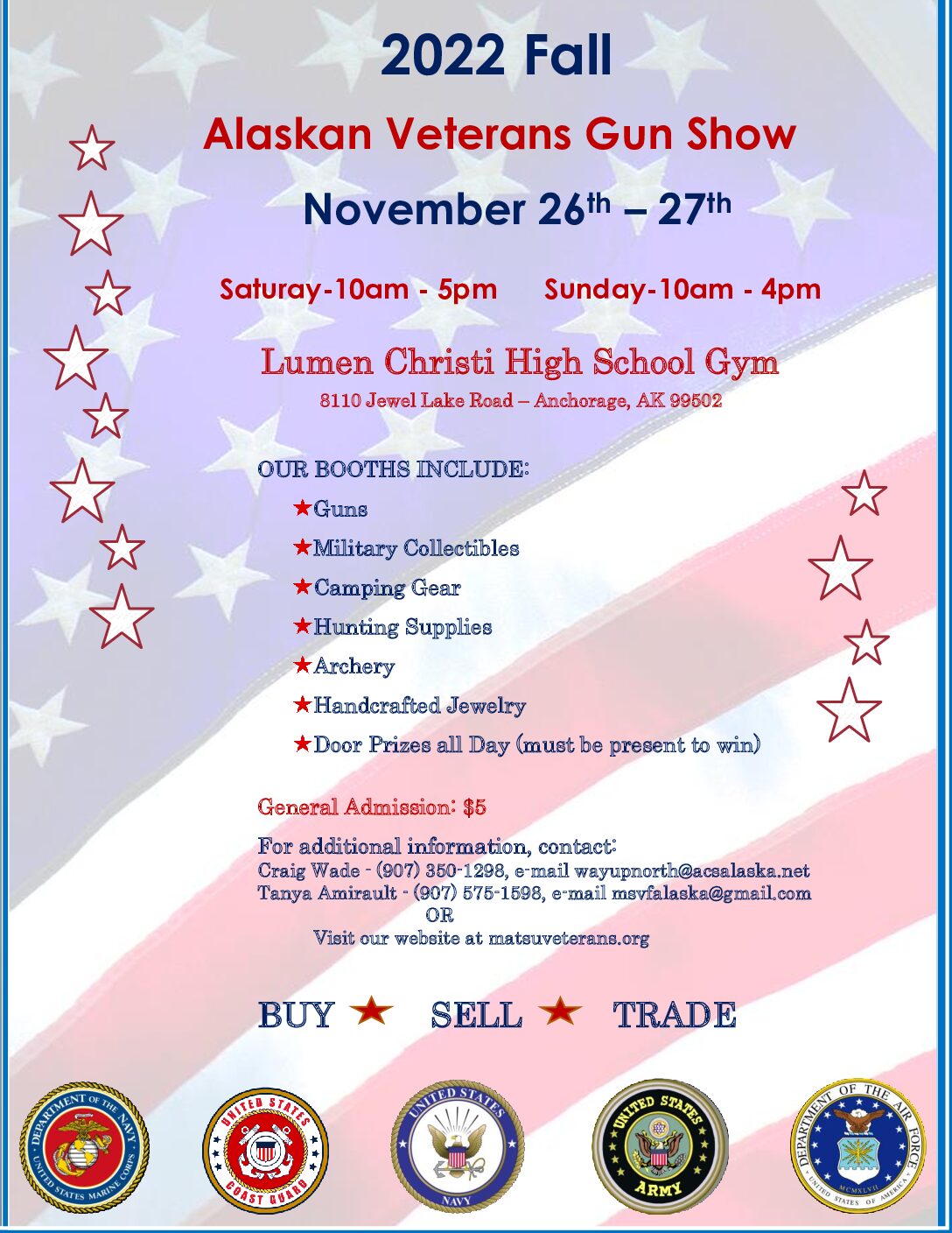 The Alaska Veterans Gun Show currently has no upcoming dates scheduled in Anchorage, AK. This Anchorage gun show is held at Lumen Christi High School and hosted by Mat-Su Veterans Foundation. All federal and local firearm laws and ordinances must be obeyed.