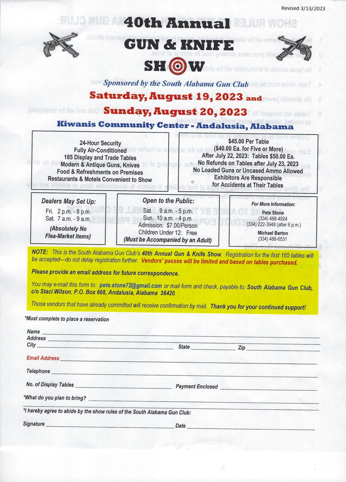 6. Tables not occupied by 7 a.m. Saturday will revert back to South Alabama Gun Club will be reassigned as needed, unless late-arrival confirmation is received.