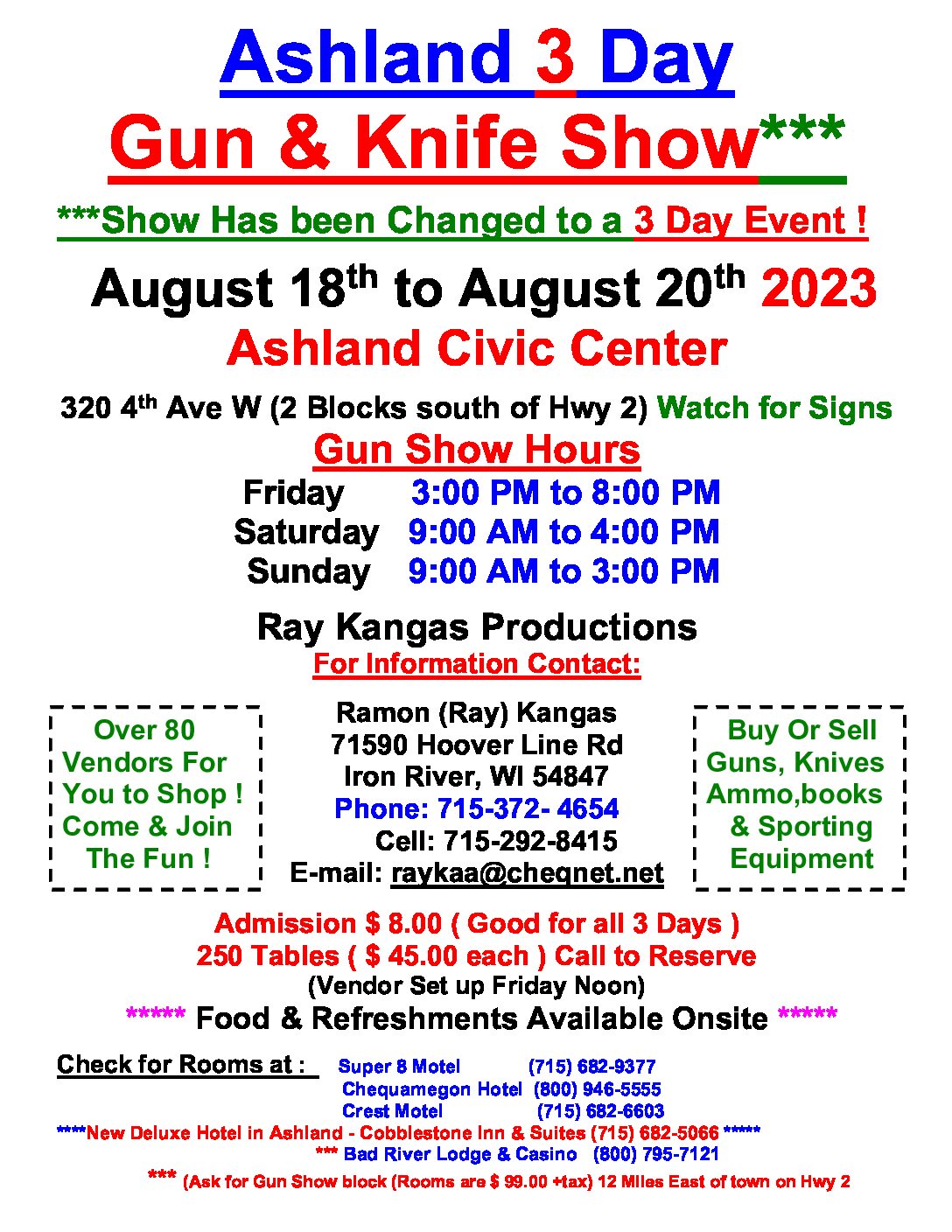 The Ashland Gun & Knife Show currently has no upcoming dates scheduled in Ashland, WI. This Ashland gun show is held at Ashland Civic Center and hosted by Ray Kangas Productions. All federal and local firearm laws and ordinances must be obeyed.