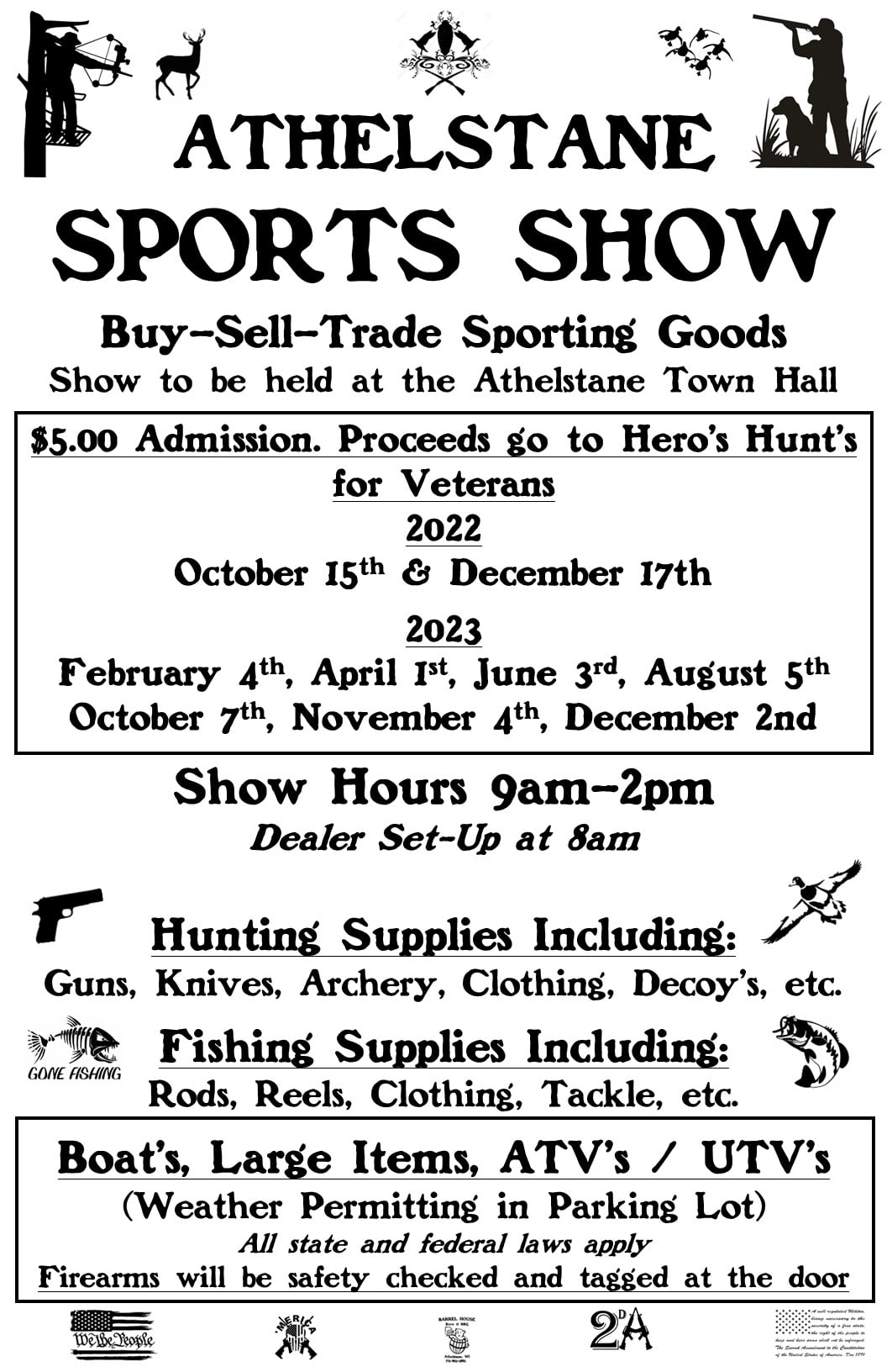 The Athelstane Sports Show currently has no upcoming dates scheduled in Athelstane, WI. This Athelstane gun show is held at Athelstane Town Hall and hosted by Storrmy's. All federal and local firearm laws and ordinances must be obeyed.
