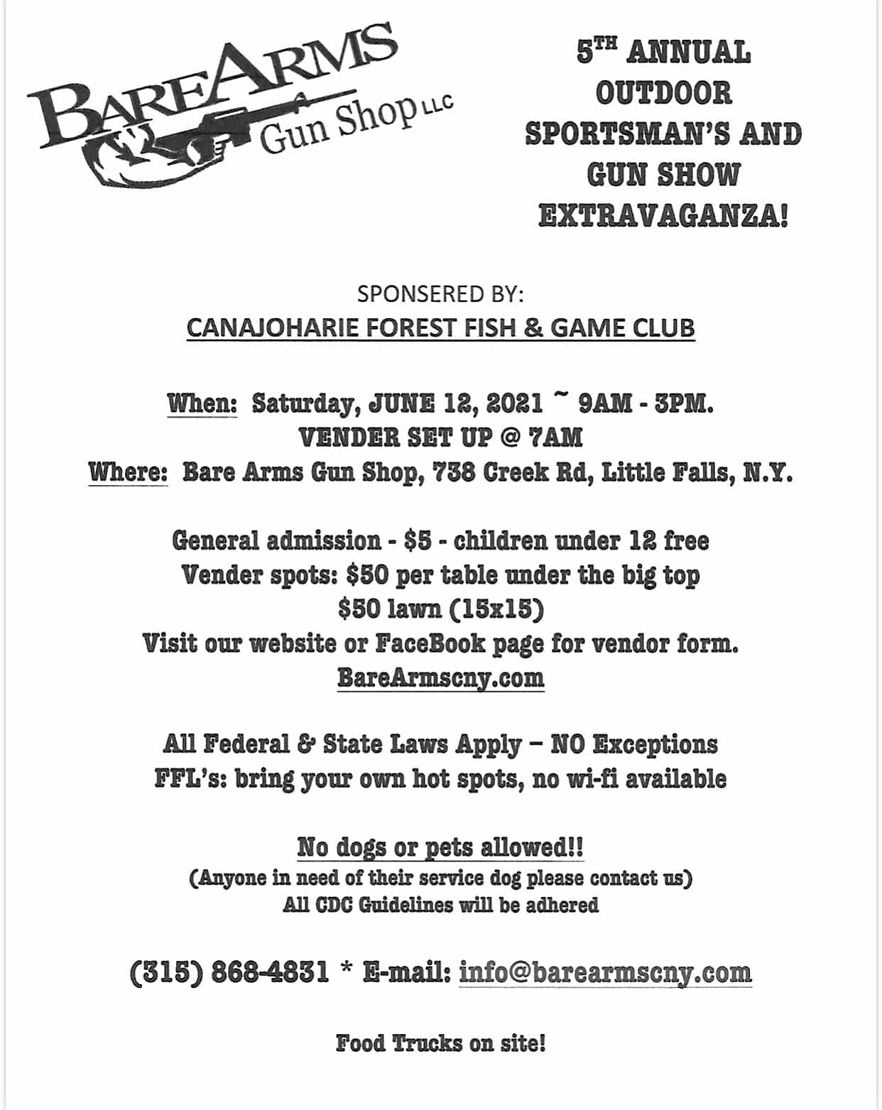 The Bare Arms Outdoor Sportsman Gun Swap Meet currently has no upcoming dates scheduled in Little Falls, NY. This Little Falls gun show is held at Bear Arms and hosted by Bare Arms Gun Shop. All federal and local firearm laws and ordinances must be obeyed.