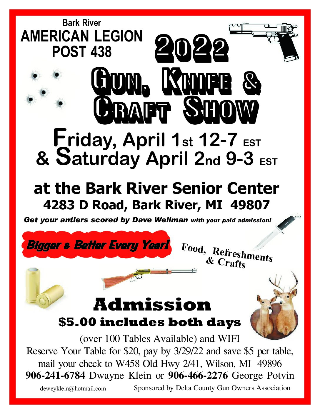 The Bark River Gun , Knife & Outdoor Show currently has no upcoming dates scheduled in Bark River, MI. This Bark River gun show is held at Bark River Senior Center and hosted by American Legion #438. All federal and local firearm laws and ordinances must be obeyed.