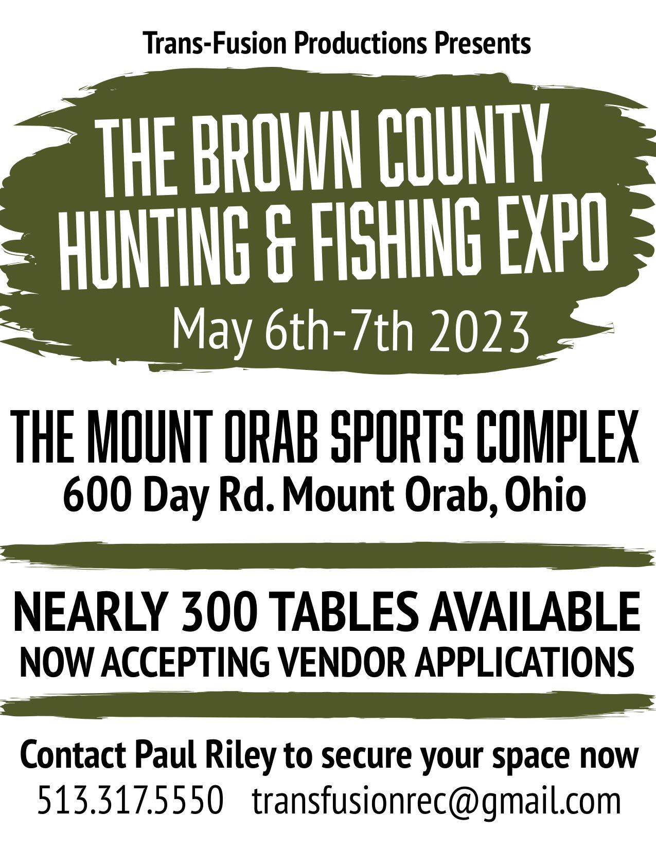 The Brown County Ohio Hunting & Fishing Expo currently has no upcoming dates scheduled in Mount Orab, OH. This Mount Orab sportsman expo is held at Mount Orab Sports Complex and hosted by Trans-Fusion Productions. All federal and local firearm laws and ordinances must be obeyed.
