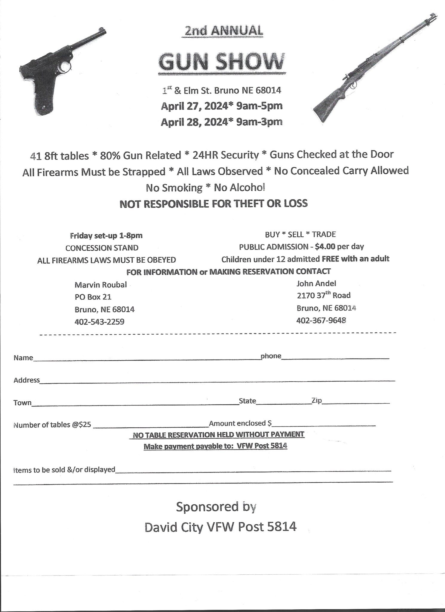 The 2nd Annual Bruno Gun Show currently has no upcoming dates scheduled in Bruno, NE. This Bruno gun show is held at Bruno Civic Center and hosted by David City VFW Post 5814. All federal and local firearm laws and ordinances must be obeyed.
