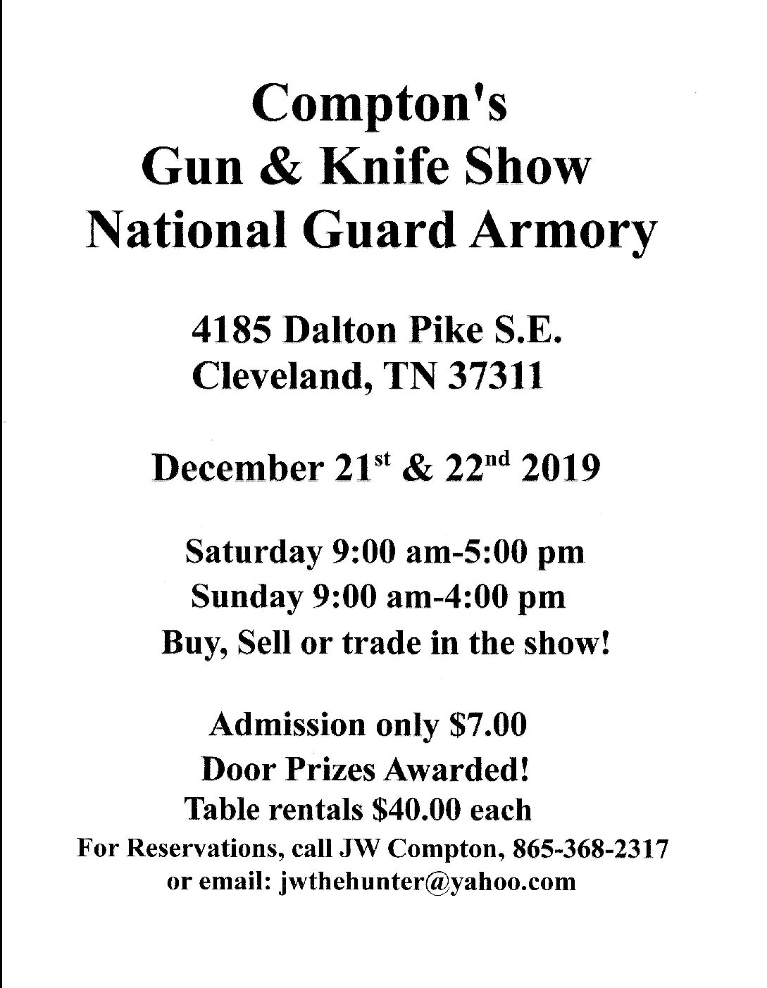 The Compton’s Gun & Knife Show currently has no upcoming dates scheduled in Cleveland, TN. This Cleveland gun show is held at National Guard Amory and hosted by Compton's Gun Shows. All federal and local firearm laws and ordinances must be obeyed.