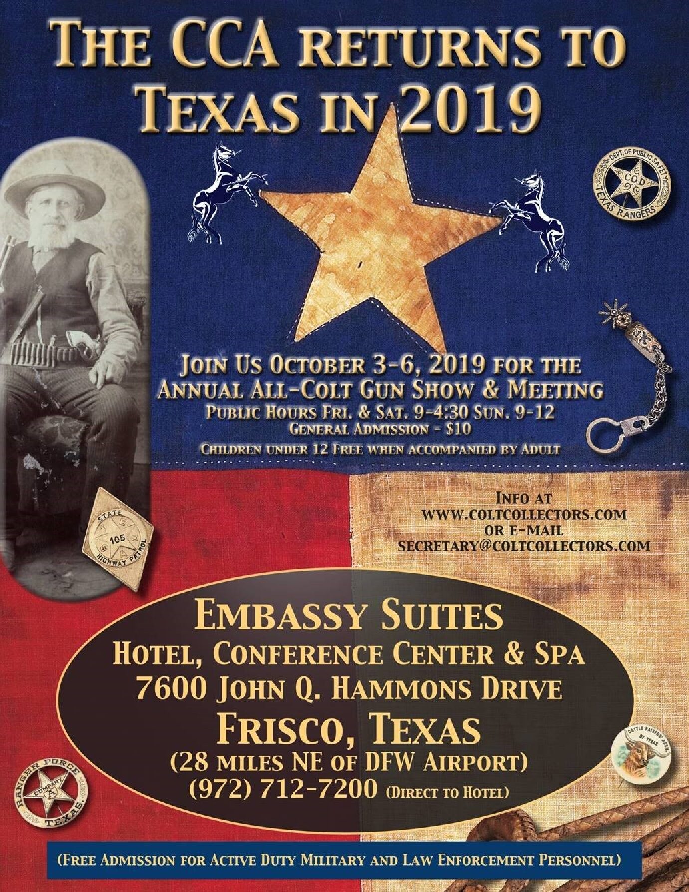 The Colt Collectors Convetion currently has no upcoming dates scheduled in Frisco, TX. This Frisco gun show is held at Embassy Suites by Hilton Dallas Frisco Hotel Convention Center & Spa and hosted by Colt Collectors Association. All federal and local firearm laws and ordinances must be obeyed.