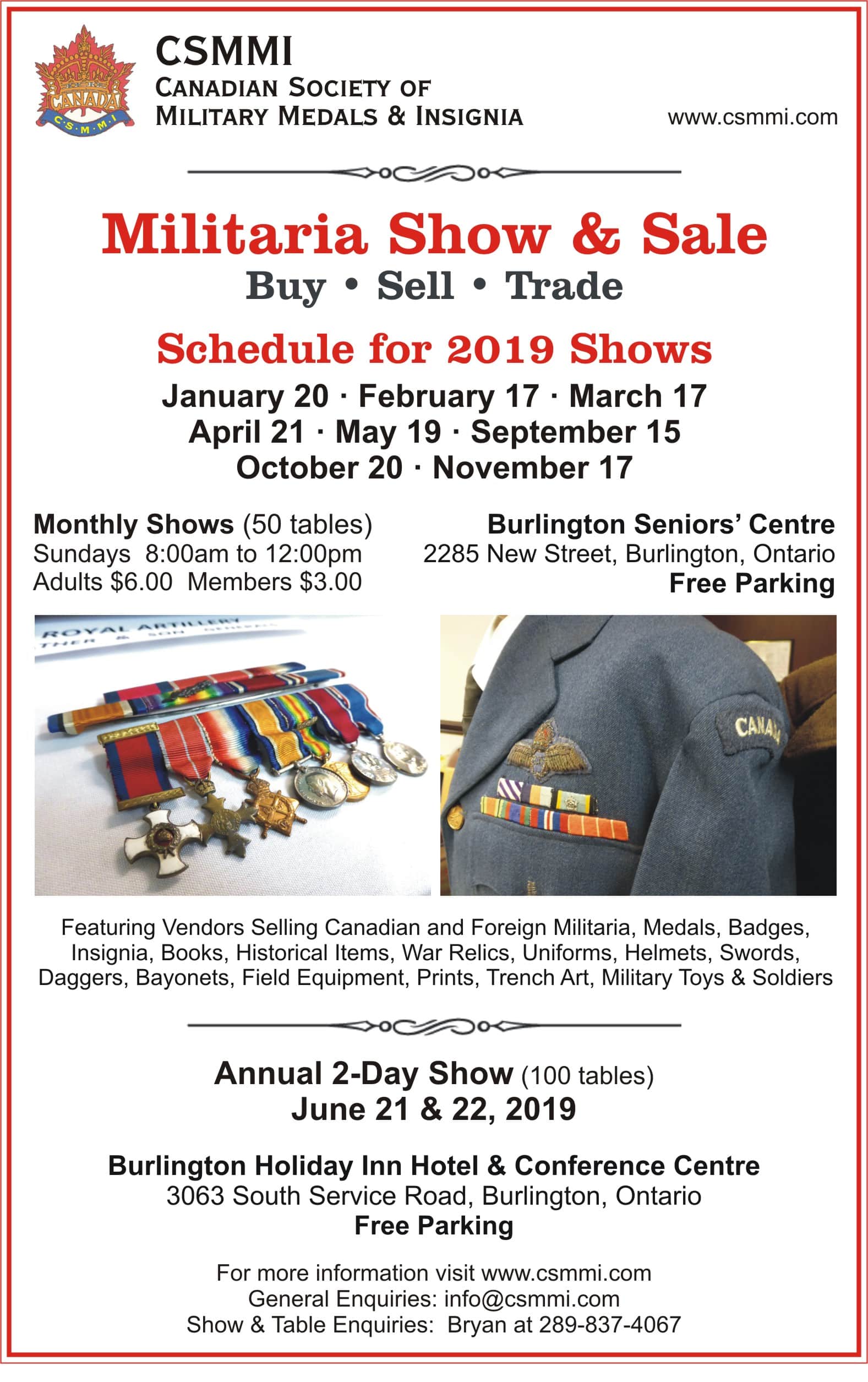 The CSMMI Militaria Show & Sale currently has no upcoming dates scheduled in Burlington, ON. This Burlington gun show is held at Burlington Seniors Centre and hosted by Canadian Society of Military Medals & Insignia. All federal and local firearm laws and ordinances must be obeyed.