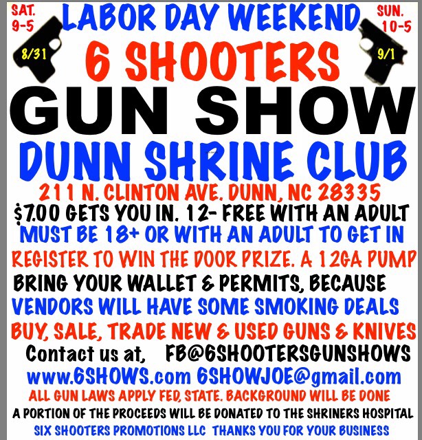 The 6 Shooters Gun Show – Dunn currently has no upcoming dates scheduled in Dunn, NC. This Dunn gun show is held at Dunn Shrine Club and hosted by 6 Shooters Gun Shows. All federal and local firearm laws and ordinances must be obeyed.