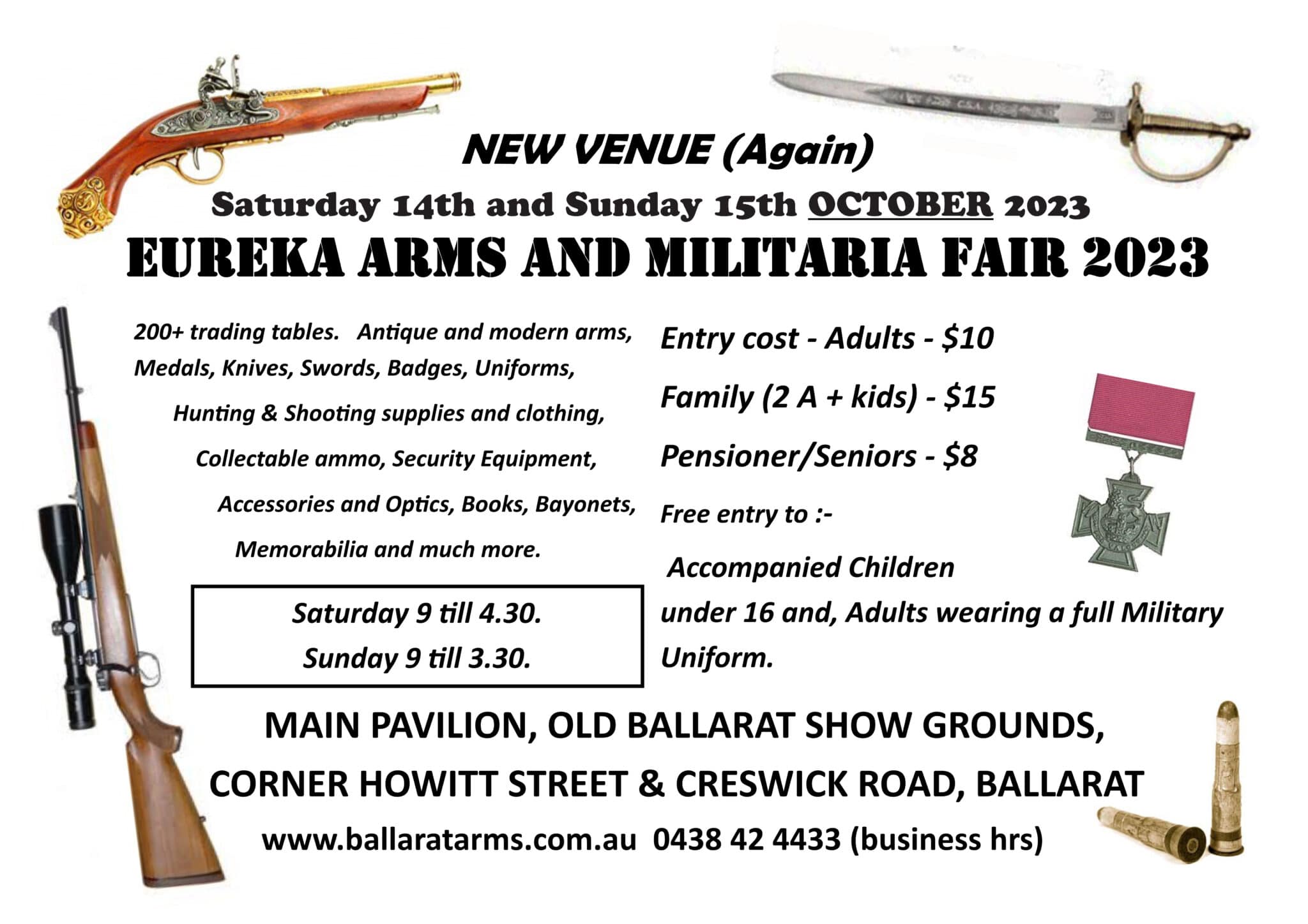 The Eureka Arms & Militaria Fair currently has no upcoming dates scheduled in Ballarat, VIC. This Ballarat gun show is held at Old Ballarat Show Grounds and hosted by Ballarat Arms and Militaria Collectors Society. All federal and local firearm laws and ordinances must be obeyed.