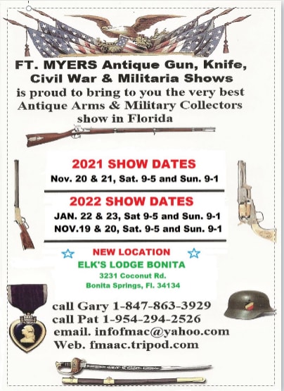 The Fort Myers Gun, Knife, Civil War & Militaria Show currently has no upcoming dates scheduled in Bonita Springs, FL. This Bonita Springs gun show is held at Elks Lodge Bonita and hosted by Fort Myers Antique Arms Collectors. All federal and local firearm laws and ordinances must be obeyed.