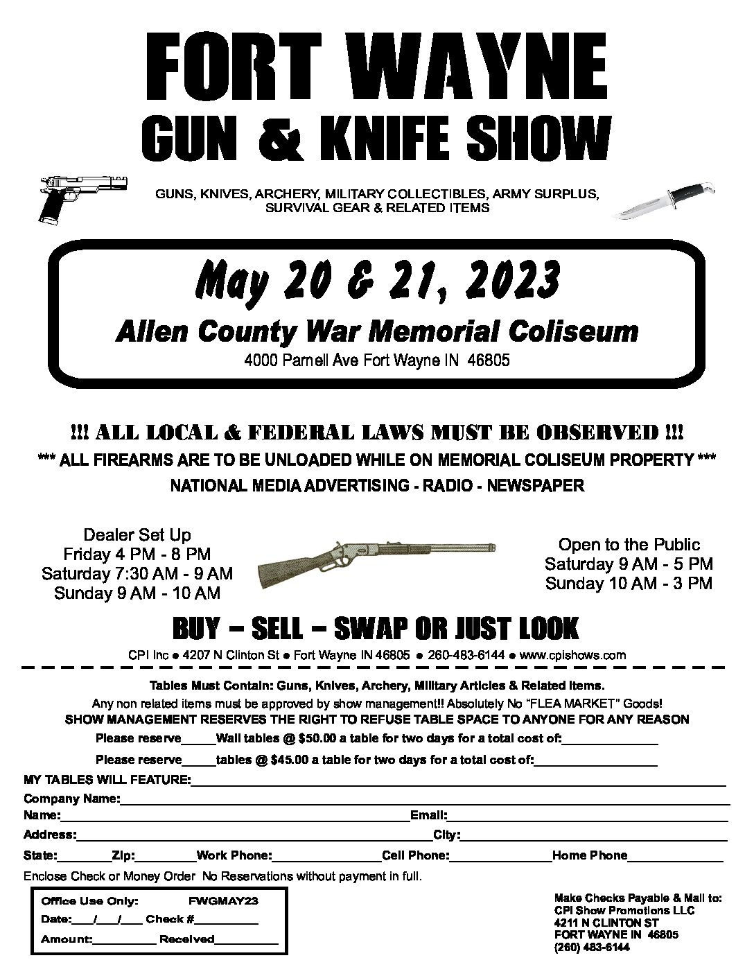 The Fort Wayne Gun & Knife Show currently has no upcoming dates scheduled in Ft Wayne, IN. This Ft Wayne gun show is held at Allen County War Memorial Coliseum and hosted by CPI Shows. All federal and local firearm laws and ordinances must be obeyed.
