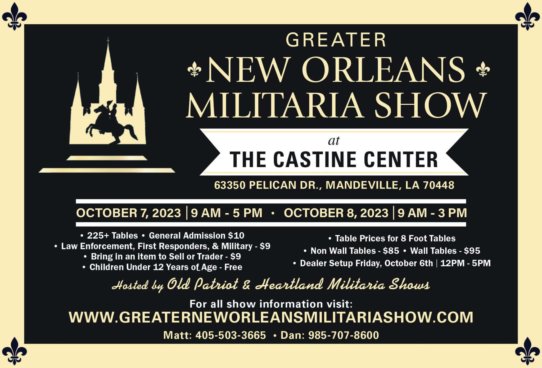 The The Greater New Orleans Militaria Show currently has no upcoming dates scheduled in Mandeville, LA. This Mandeville gun show is held at Castine Center and hosted by Greater New Orleans Militaria Show. All federal and local firearm laws and ordinances must be obeyed.