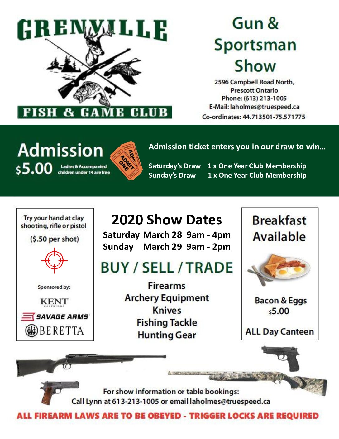 The Grenville Fish & Game Club Gun & Sportsman Show currently has no upcoming dates scheduled in Prescott, ON. This Prescott gun show is held at Grenville Fish & Game Club and hosted by Grenville Fish & Game Club Gun. All federal and local firearm laws and ordinances must be obeyed.