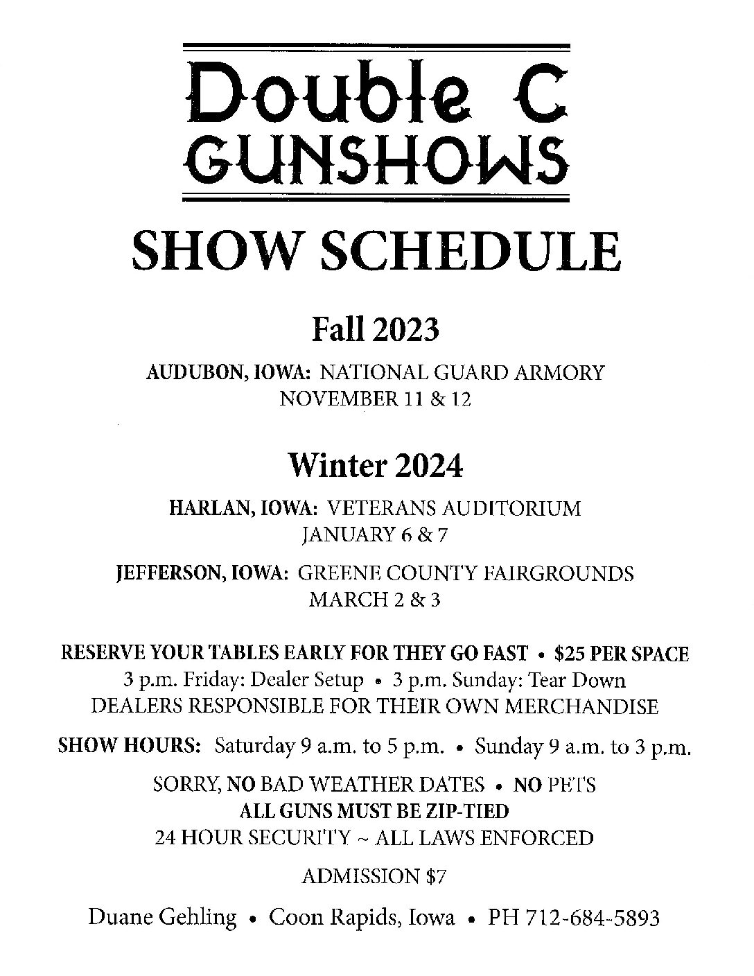 The Harlan Iowa Gun Show currently has no upcoming dates scheduled in Harlan, IA. This Harlan gun show is held at Veteran's Memorial Auditorium and hosted by Double C. All federal and local firearm laws and ordinances must be obeyed.