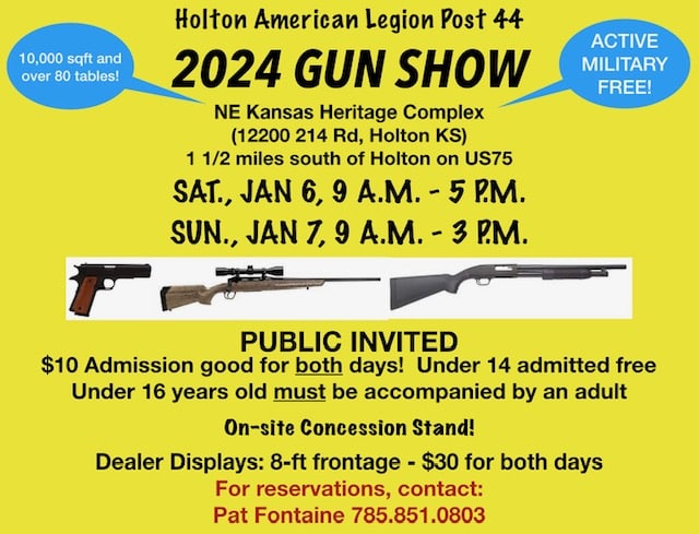 The Holton American Legion Gun Show currently has no upcoming dates scheduled in Holton, KS. This Holton gun show is held at NE Kansas Heritage Complex and hosted by Holton American Legion. All federal and local firearm laws and ordinances must be obeyed.