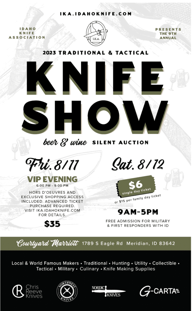 Saturday, August 12th , 9a-5p is the general show open to the public. Tickets are available at the door for $6. It all takes place at the Courtyard Marriott at 1789 S. Eagle Rd in Meridian, ID. Don’t miss this chance to see heirloom quality blades at a broad range of price points. You are sure to be amazed!