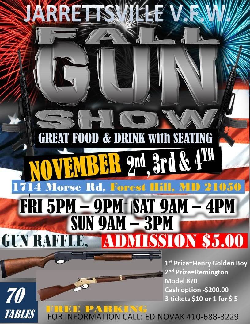 The Jarrettsville VFW Gun Show currently has no upcoming dates scheduled in Forest Hill, MD. This Forest Hill gun show is held at Jarrettsville VFD Post #8672 and hosted by Jarrettsville VFW Gun Show. All federal and local firearm laws and ordinances must be obeyed.