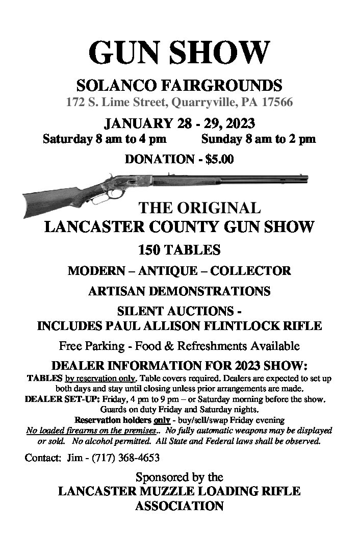 SATURDAY & SUNDAY–Gun Show, Jan 28th – 29th, 2023. 66th Annual Annual Show sponsored by Lancaster Muzzle Loading Rifle Assoc. (LMLRA,), Solanco Fairgrounds. Sat: 8 a.m. – 4 p.m., Sun: 8 a.m. – 2 p.m. Donation: $5. More than one hundred tables. Modern and antique guns, muzzleloaders, black powder items, knives, collectibles, books and accessories. Info, call (717) 368-4653.