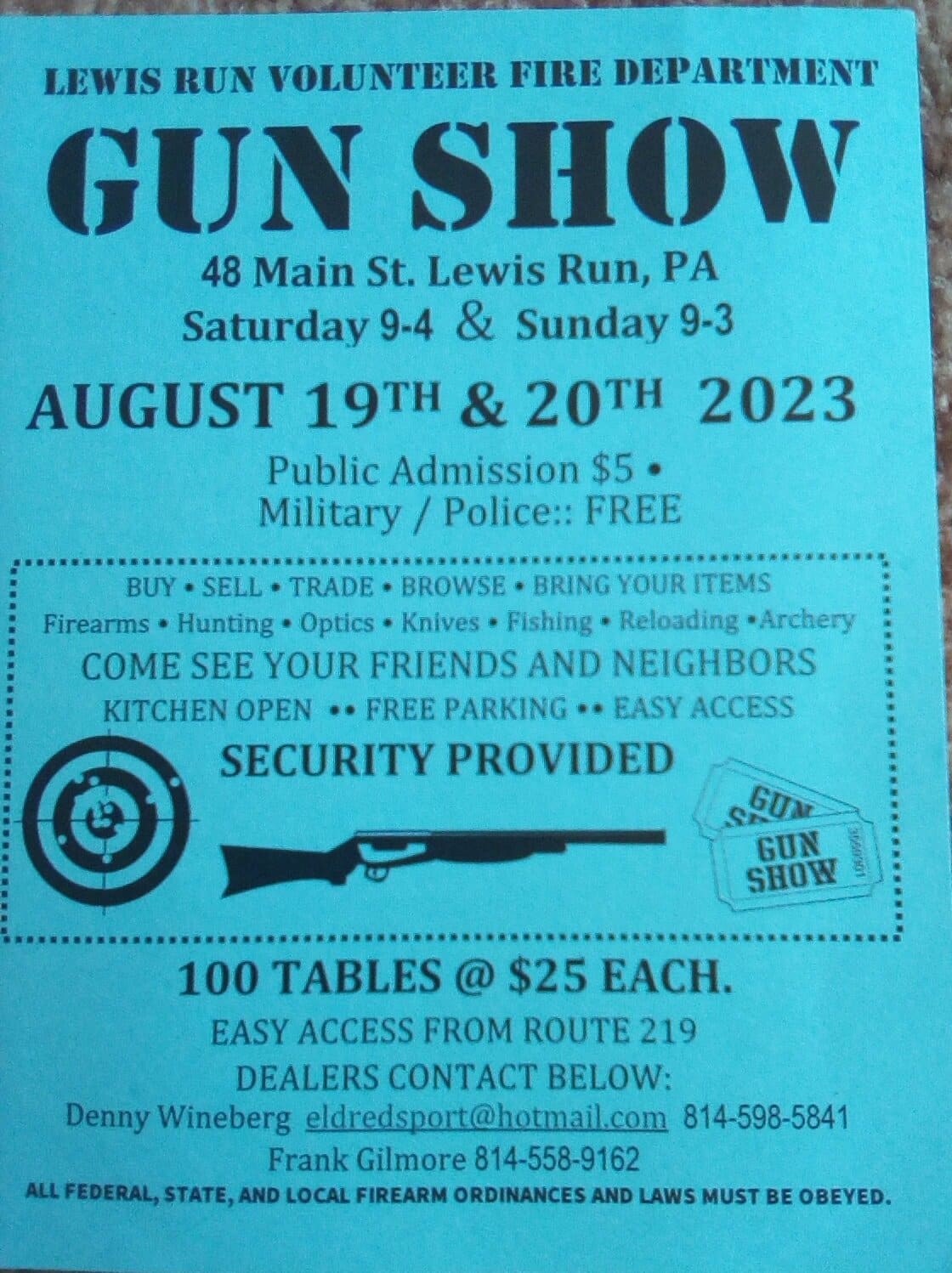 The Lewis Run Volunteer Fire Department Gun Show currently has no upcoming dates scheduled in Lewis Run, PA. This Lewis Run gun show is held at Lewis Run VFD Station 6 and hosted by Lewis Run Volunteer Fire Department. All federal and local firearm laws and ordinances must be obeyed.