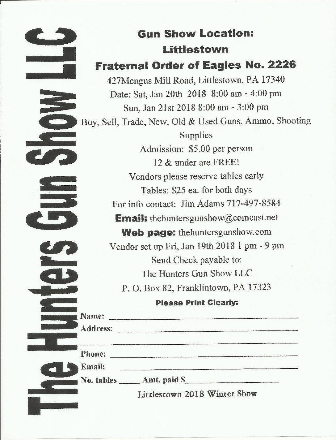 The Hunter’s Littlestown Gun Show currently has no upcoming dates scheduled in Littlestown, PA. This Littlestown gun show is held at Littlestown Fraternal Order Of Eagles and hosted by Hunters Gun Show LLC. All federal and local firearm laws and ordinances must be obeyed.