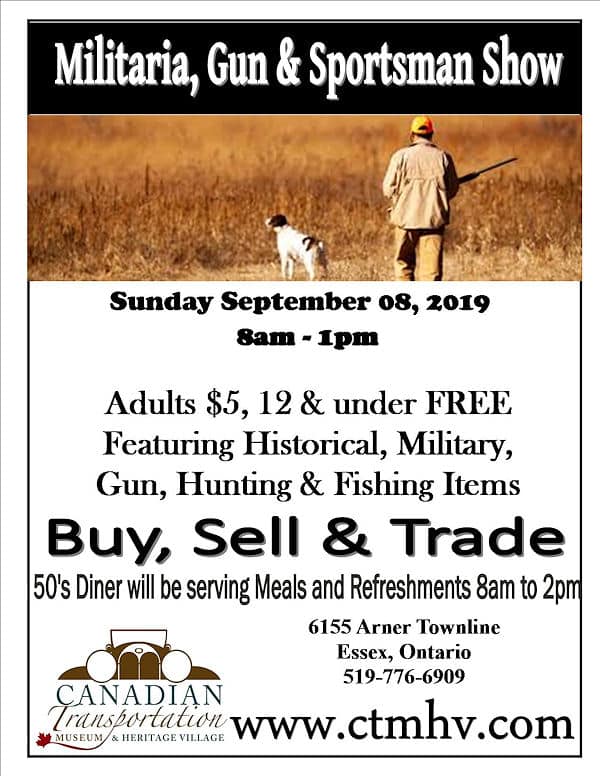 The Kingsville Militaria, Gun & Sportsman Show currently has no upcoming dates scheduled in Kingsville, ON. This Kingsville gun show is held at Canadian Transportation Museum & Heritage Village and hosted by Canadian Transportation Museum & Heritage Village. All federal and local firearm laws and ordinances must be obeyed.