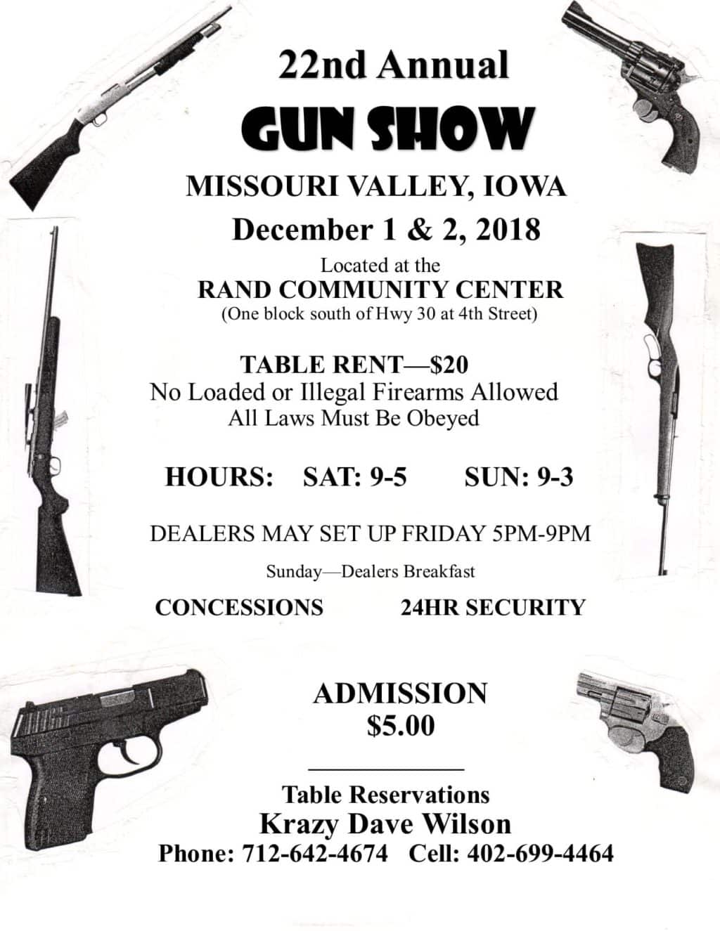 The Missouri Valley Gun Show currently has no upcoming dates scheduled in Missouri Valley, IA. This Missouri Valley gun show is held at Rand Community Center and hosted by Krazy Dave Wilson. All federal and local firearm laws and ordinances must be obeyed.