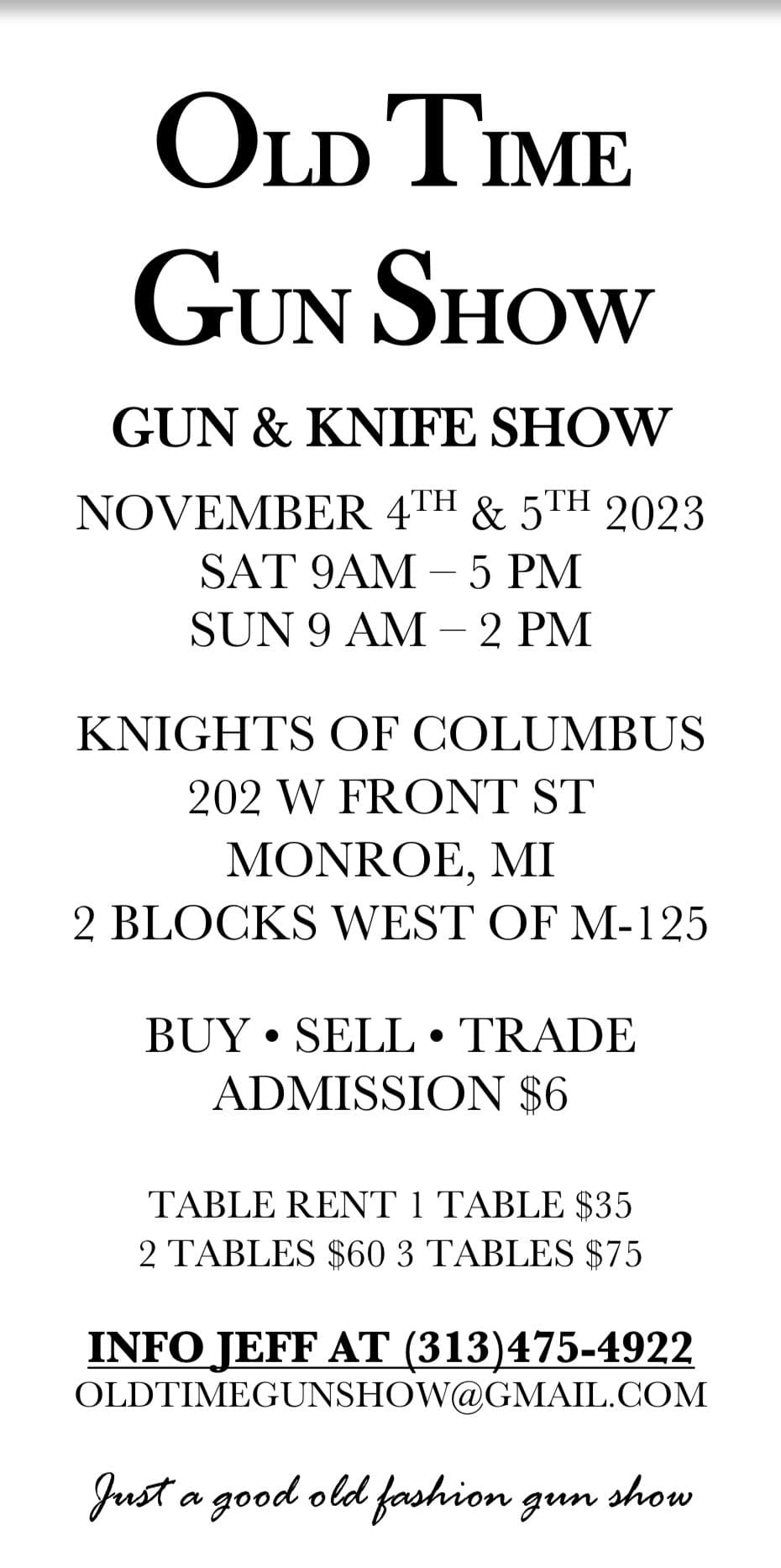 The Old Time Gun Show currently has no upcoming dates scheduled in Monroe, MI. This Monroe gun show is held at Knights of Columbus and hosted by Old Time Gun Show. All federal and local firearm laws and ordinances must be obeyed.