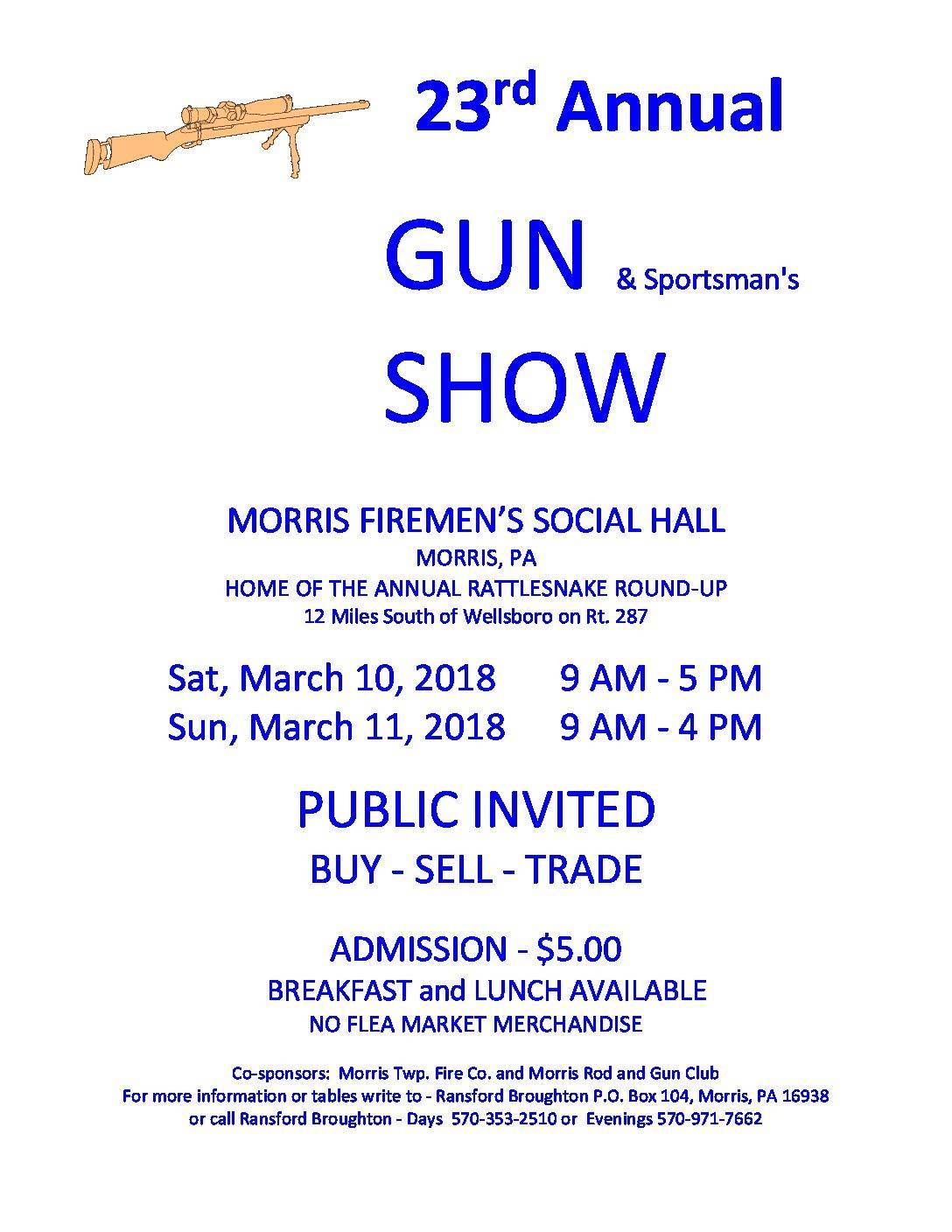 The Morris Gun & Sportsman Show currently has no upcoming dates scheduled in Morris, PA. This Morris gun show is held at Morris Firemen's Social Hall and hosted by Morris Fire Co. All federal and local firearm laws and ordinances must be obeyed.