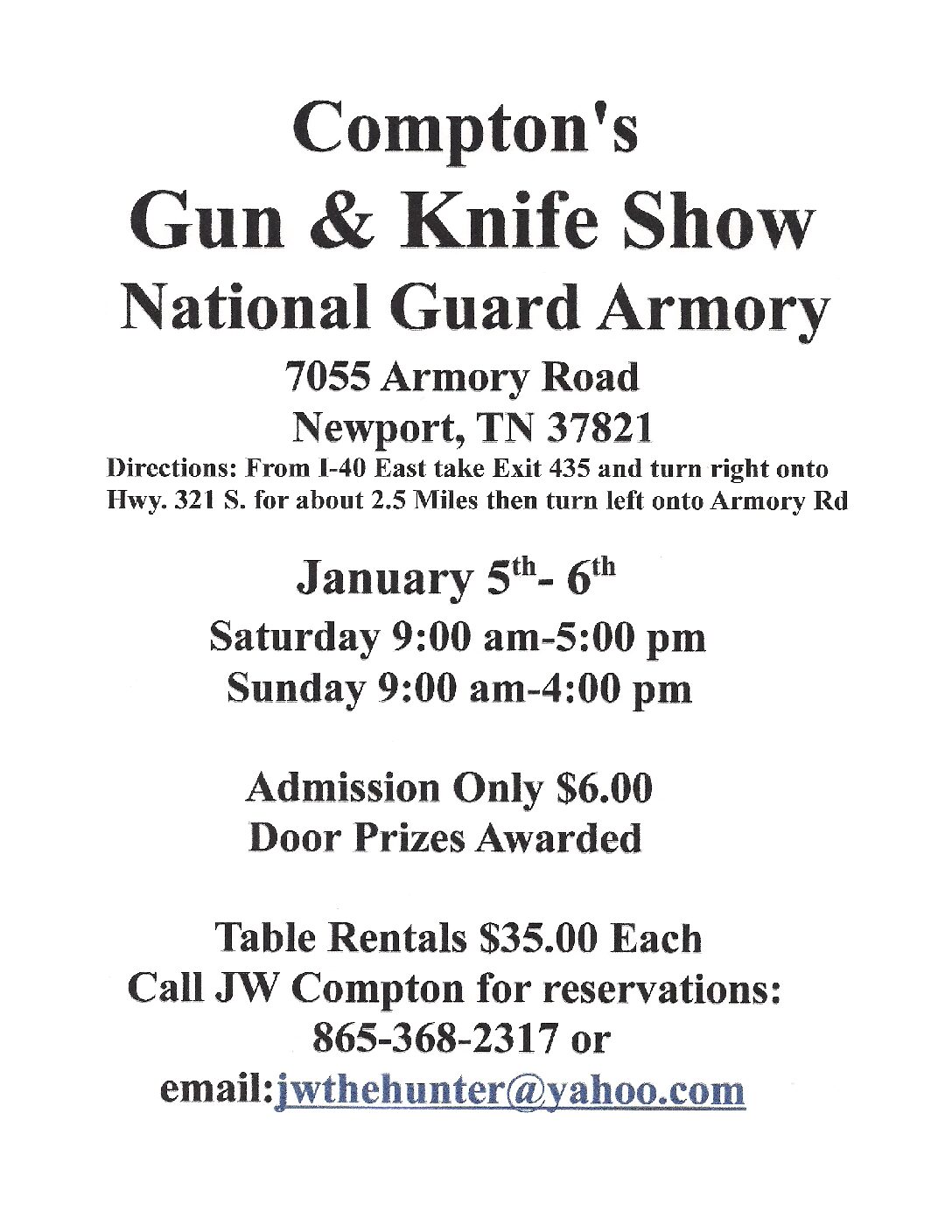 The Compton’s Gun & Knife Show currently has no upcoming dates scheduled in Newport, TN. This Newport gun show is held at National Guard Armory and hosted by Compton's Gun Shows. All federal and local firearm laws and ordinances must be obeyed.