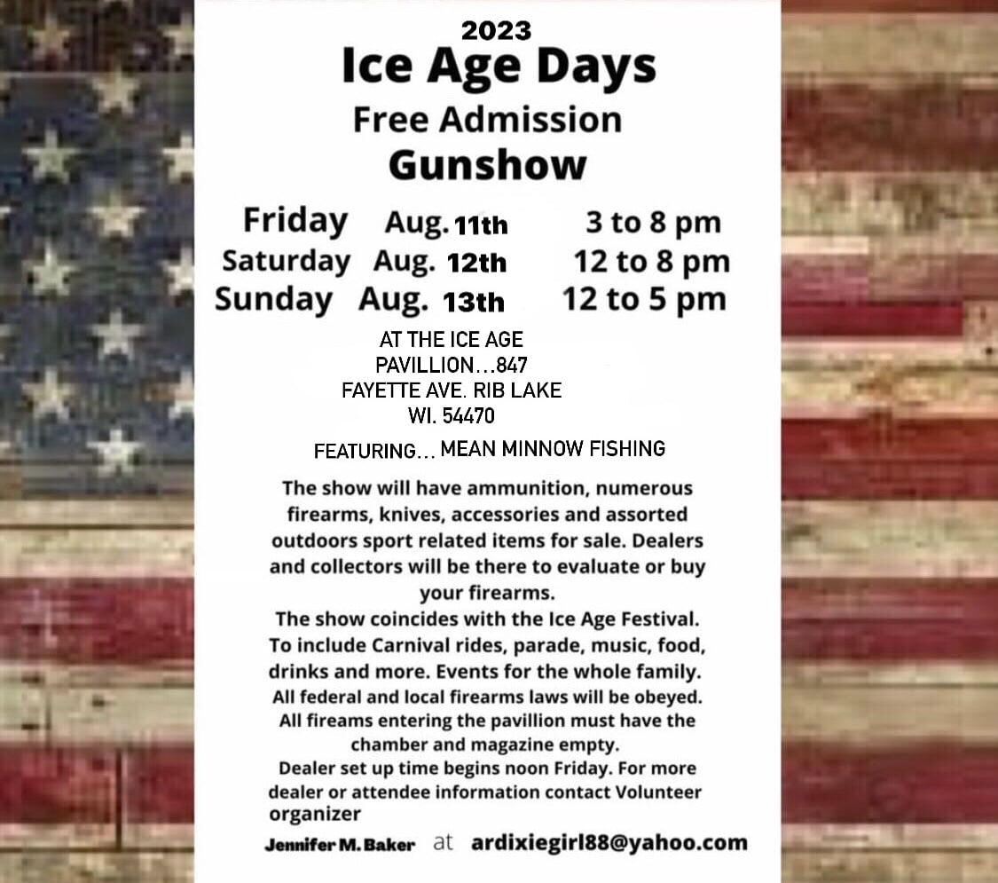 The gun show is being sponsored as part of the Ica Age DayThe (Free Admission ) Rib Lake Gun Show is held indoors at the Ice Age Pavilion in concert with the Rib Lake Ice Age Days Festival. There are many events, Circus rides and games, a parade, car show and to many other events to list. There will be Private Collectors and Dealers at the show with Knives, Firearms, ammunition and accessories for sale. They will also be available to evaluate and purchase your firearms and accessories as well.