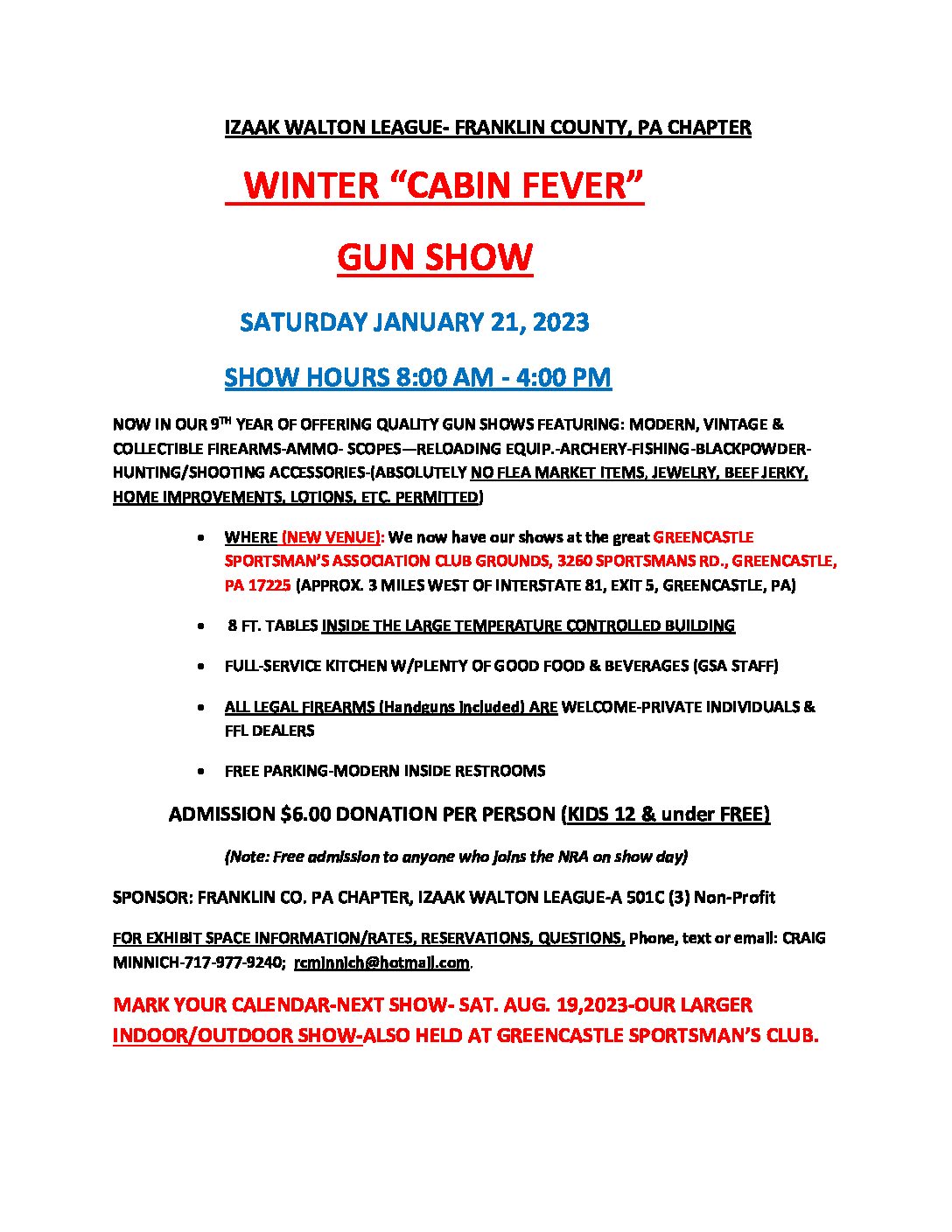 All legal firearms welcome including long guns, handguns, black powder guns. FFL licensed dealers on site to handle any required firearm transfers. All Federal, State and local ordinances must be obeyed. Firearms displayed must be unloaded and tie strapped to prevent loading & closing action. No flea market items, watches, T-shirts, beanie babies, etc.; only outdoor sporting related items.