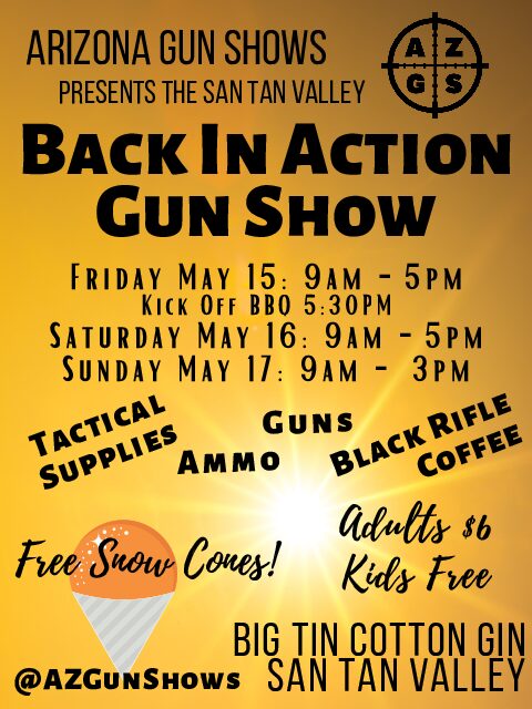 The Back In Action Gun Show currently has no upcoming dates scheduled in San Tan Valley, AZ. This San Tan Valley gun show is held at Big Tin Cotton Gin and hosted by Arizona Gun Shows. All federal and local firearm laws and ordinances must be obeyed.