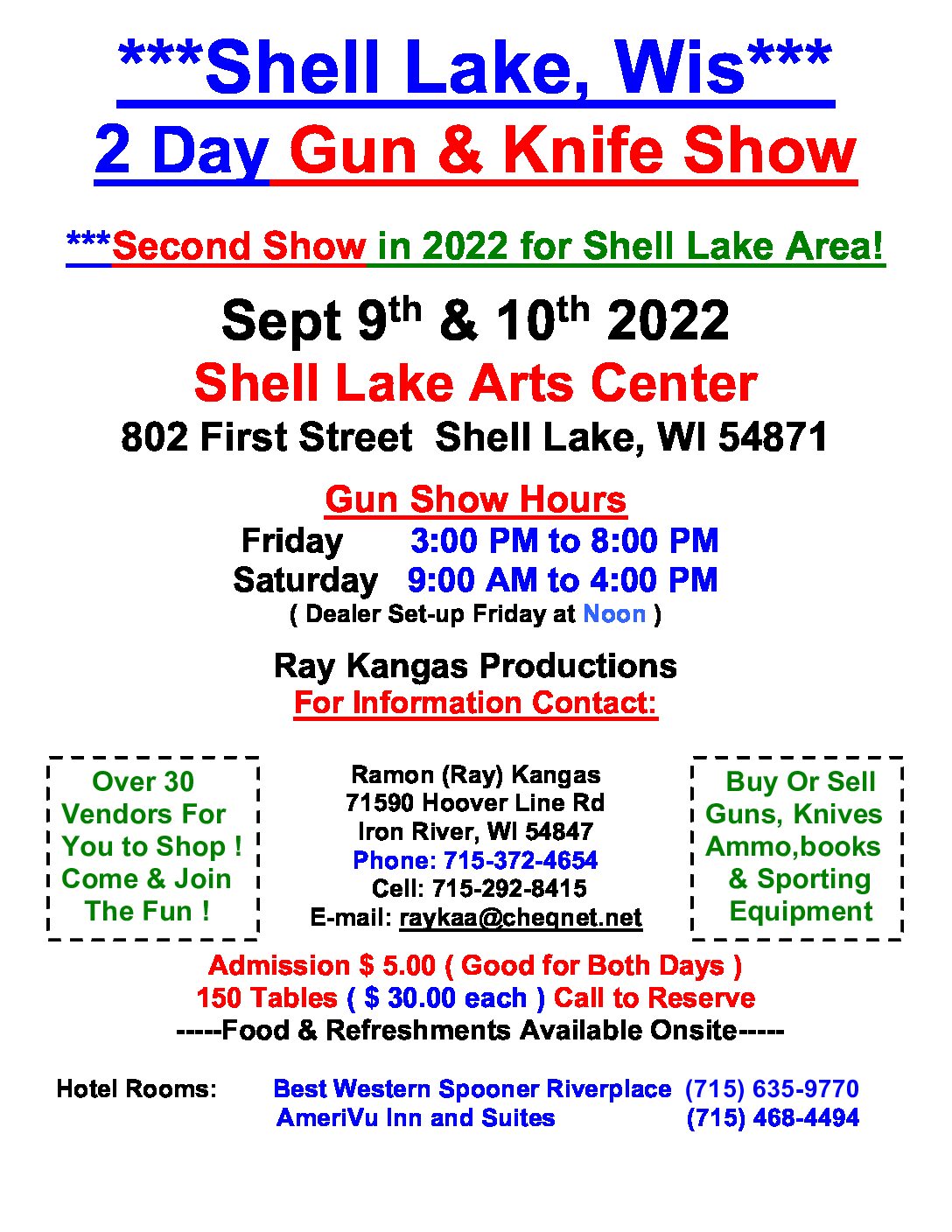 The Shell Lake Gun & Knife Show currently has no upcoming dates scheduled in Shell Lake, WI. This Shell Lake gun show is held at Shell Lake Arts Center and hosted by Ray Kangas Productions. All federal and local firearm laws and ordinances must be obeyed.