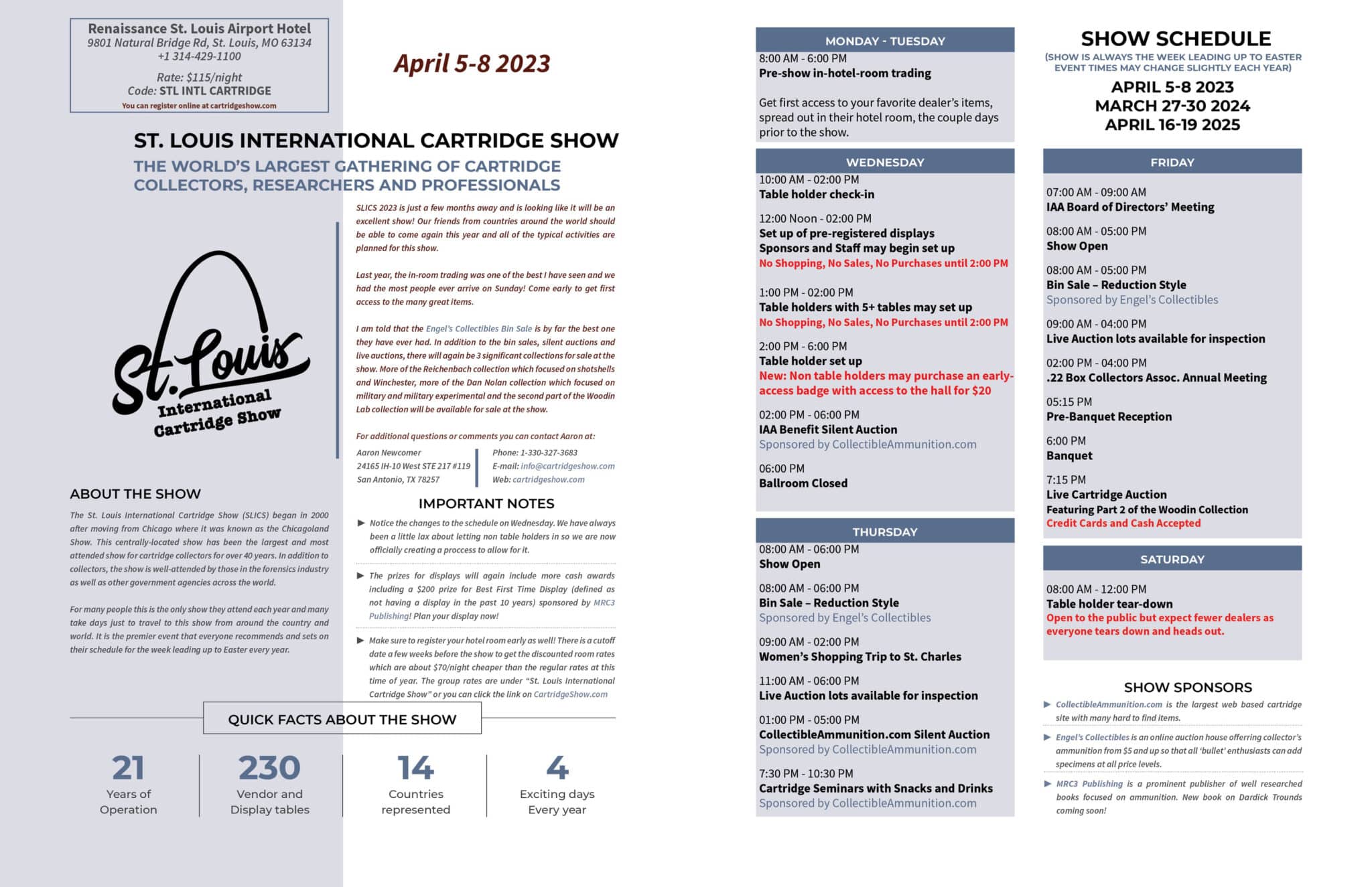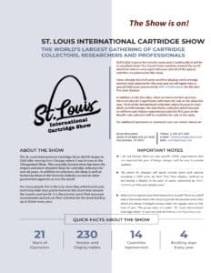 The St. Louis International Cartridge Show (SLICS) began in 2000 after moving from Chicago where it was known as the Chicagoland Show. This centrally-located show has been the largest and most attended show for cartridge collectors for over 40 years. In addition to collectors, the show is well-attended by those in the forensics industry as well as other government agencies across the world.