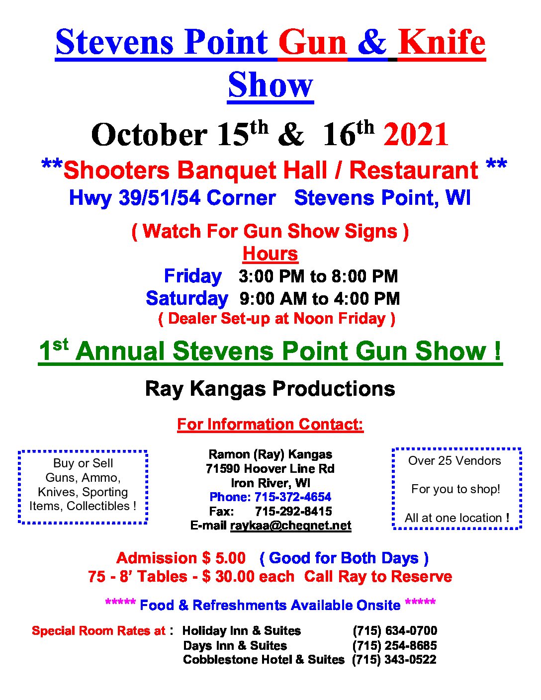 The Stevens Point/Arnott Gun Show currently has no upcoming dates scheduled in Plover, WI. This Plover gun show is held at Shooter’s Banquet and hosted by Ray Kangas Productions. All federal and local firearm laws and ordinances must be obeyed.