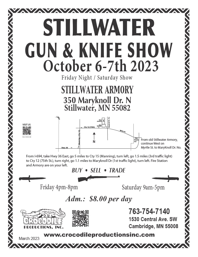 The Stillwater Gun & Knife Show currently has no upcoming dates scheduled in Stillwater, MN. This Stillwater gun show is held at Stillwater Armory and hosted by Crocodile Productions. All federal and local firearm laws and ordinances must be obeyed.