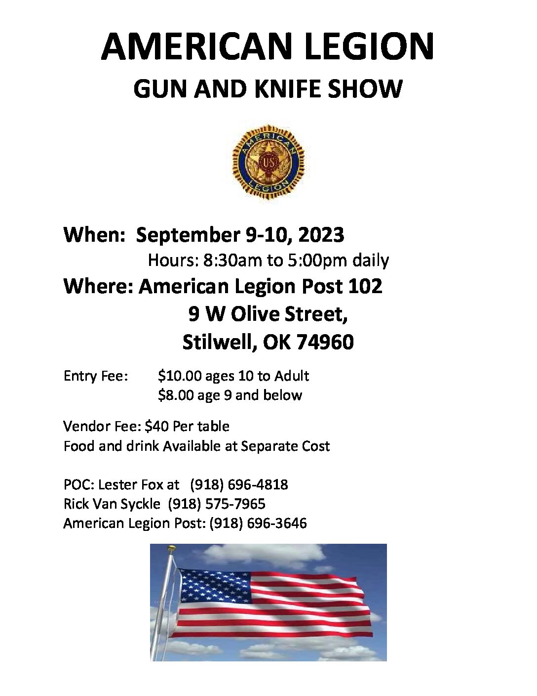 The Stilwell Gun & Knife Show currently has no upcoming dates scheduled in Stilwell, OK. This Stilwell gun show is held at American Legion and hosted by American Legion Post 102. All federal and local firearm laws and ordinances must be obeyed.