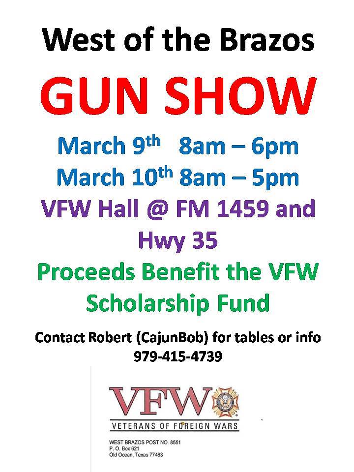The West of the Brazos Gun Show currently has no upcoming dates scheduled in Sweeny, TX. This Sweeny gun show is held at VFW Post 8551 and hosted by Veterans of Foreign Wars. All federal and local firearm laws and ordinances must be obeyed.