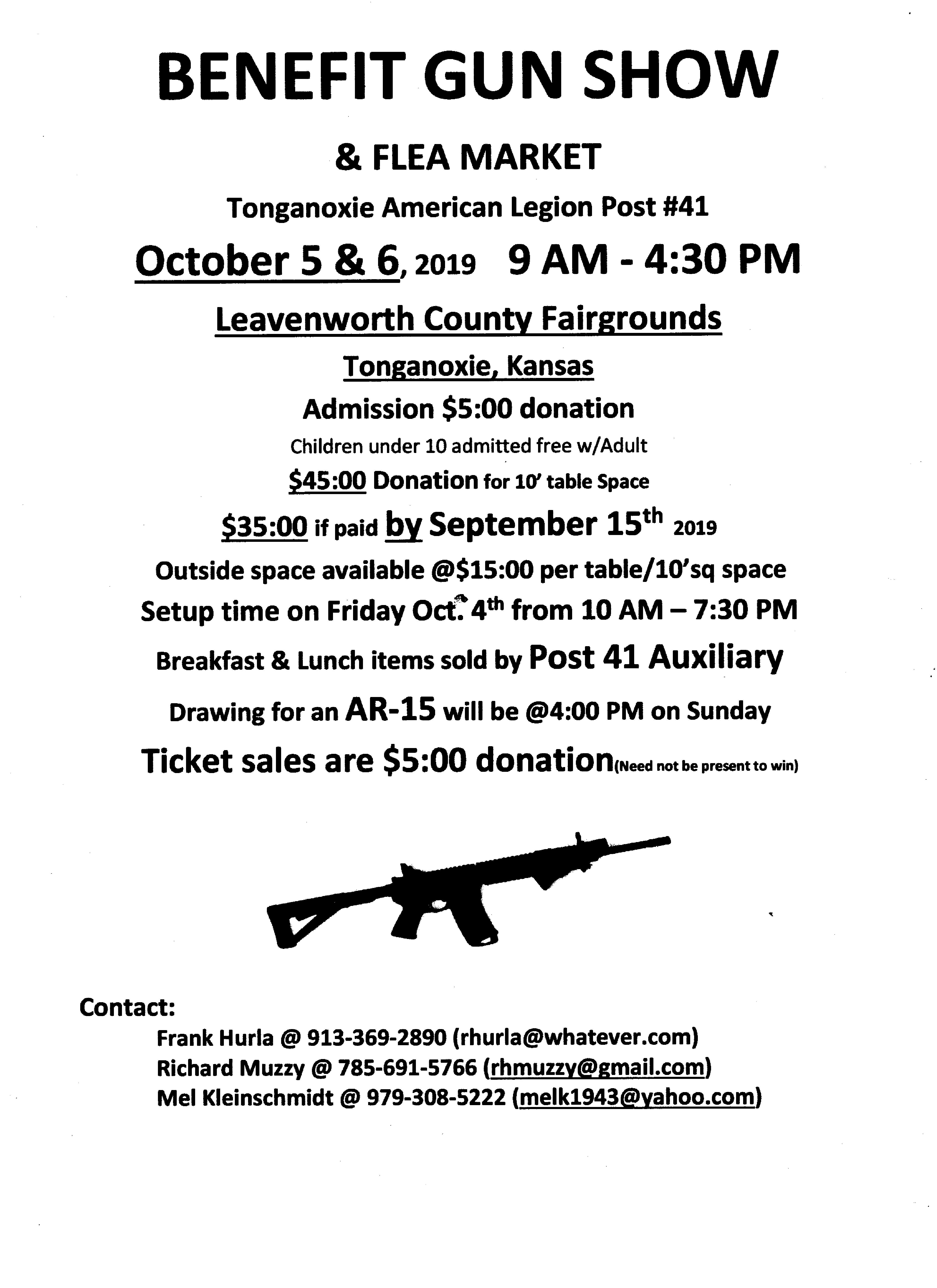 The Tongannoxie Benefit Gun Show & Flea Market currently has no upcoming dates scheduled in Tonganoxie, KS. This Tonganoxie gun show is held at Leavenworth County Fairgrounds and hosted by American Legion Post #41. All federal and local firearm laws and ordinances must be obeyed.