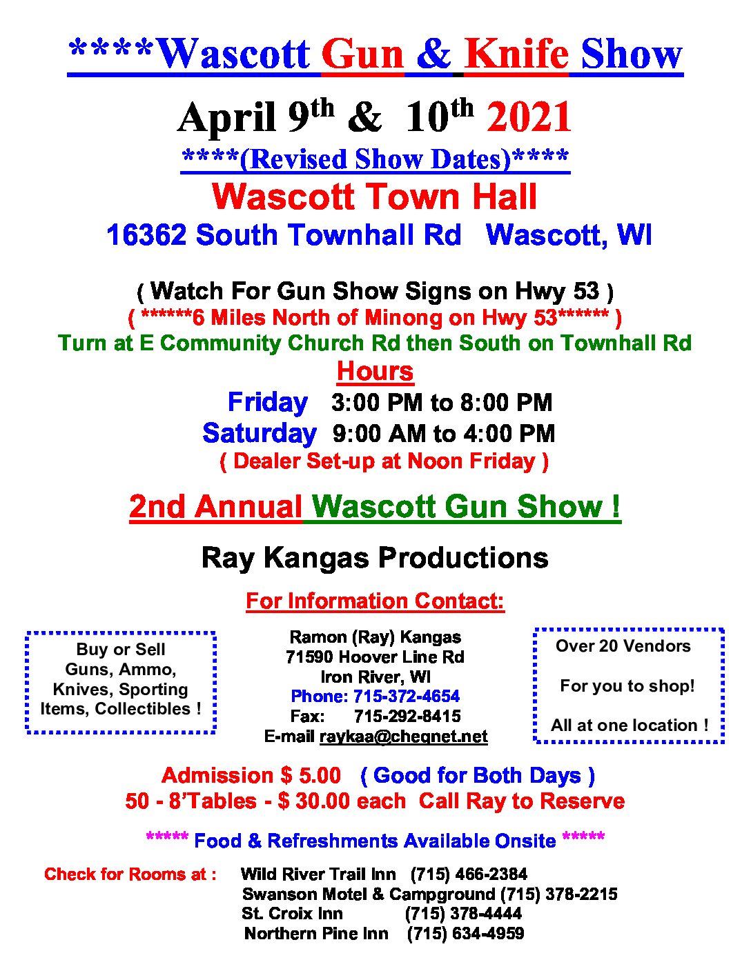 The Wascott Gun & Knife Show currently has no upcoming dates scheduled in Minong, WI. This Minong gun show is held at Wascott Town Hall and hosted by Ray Kangas Productions. All federal and local firearm laws and ordinances must be obeyed.