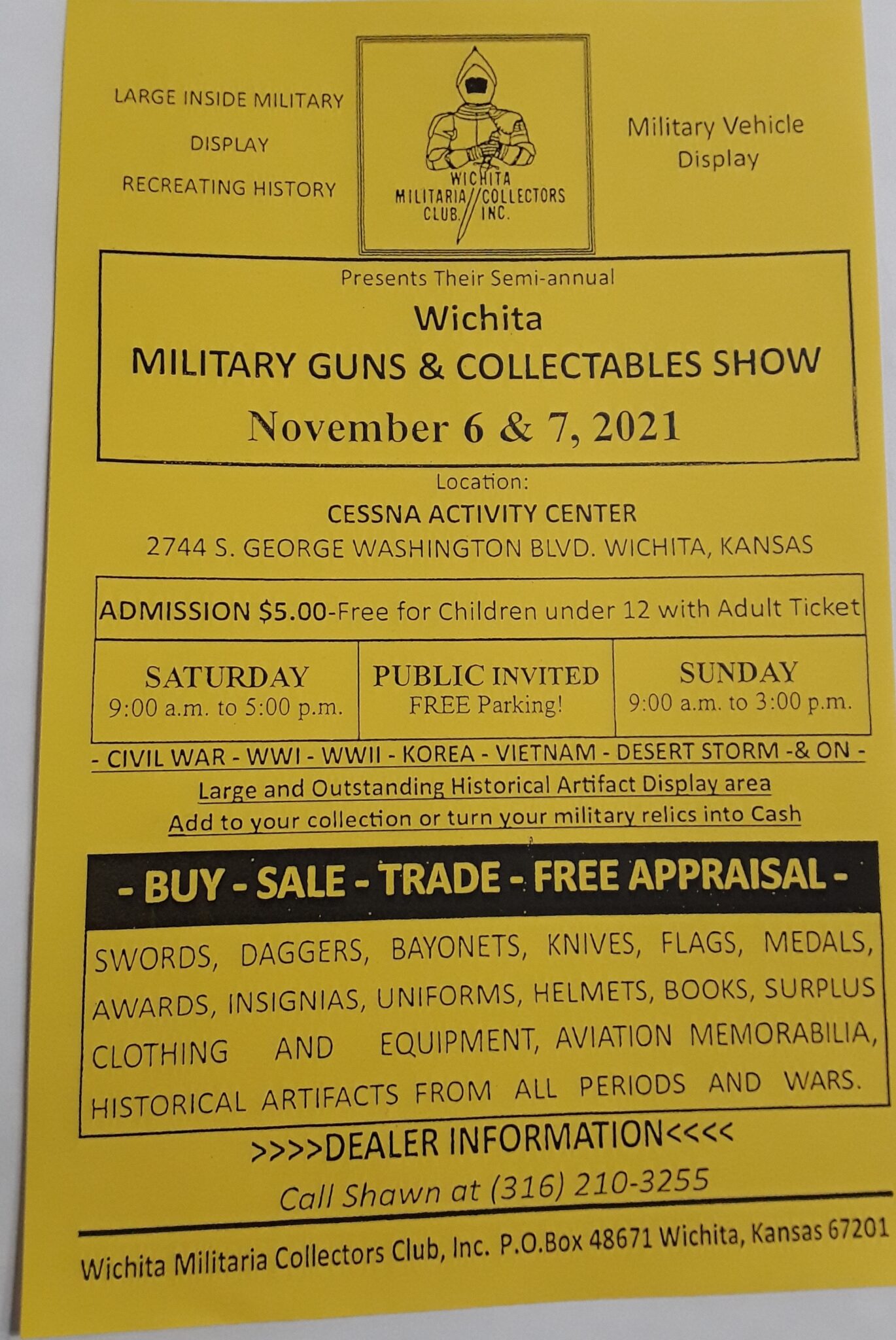 The Wichita Military Guns & Collectibles Show currently has no upcoming dates scheduled in Wichita, KS. This Wichita gun show is held at Cessna Activity Center and hosted by Wichita Military Collectors Club. All federal and local firearm laws and ordinances must be obeyed.